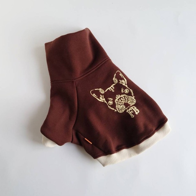 ドルチェビータ/ブラウン ココアのようなブラウンにクリーム色のリブが可愛い 背中にもクリーム色の伝七プリント トレーナーに、シルクスクリーンで一着一着プリントしています イタリアではタートルネックをドルチェビータと呼ぶそうです 身頃は、裏パイルであたたか 柔らかくて動きやすい コットン100%で静電気が起きにくいです 伝七商店のハイネックは 首周りにゴムを縫い込んで ずり落ちないようにひと工夫しています [素材] 生地:綿100%(裏パイル) ご購入くださった方はLINEや、メッセージで「ご注文されたかたのお名前」と「注文したよ」といれていただければ、発送のお知らせもこちらからメッセージいたしますので、ぜひお声がけください♪ メールが届かないケースが多くございますので、ぜひメッセージをご利用くださいませ うちのこぴったりオーダーの、犬服の店 伝七商店ショップサイトはこちら https://den7sho-ten.net ※当店のお洋服は、ひとつひとつ手づくりでお作りしております 他のショップでも取り扱っておりますため、在庫が前後する場合がございます 在庫切れの際は、キャンセル(返金、交換等)の対応させていただきます 何卒、ご了承くださいませ