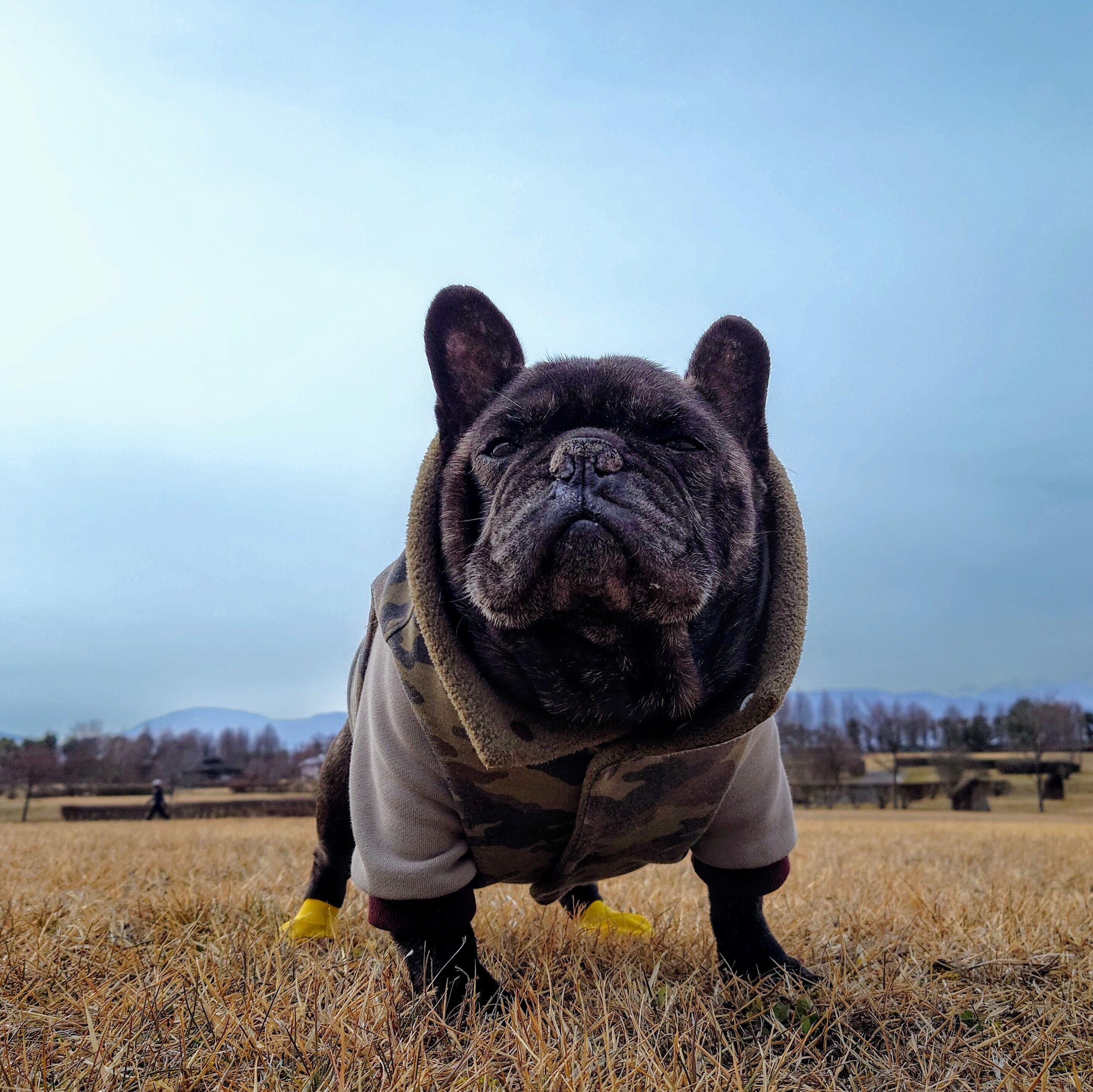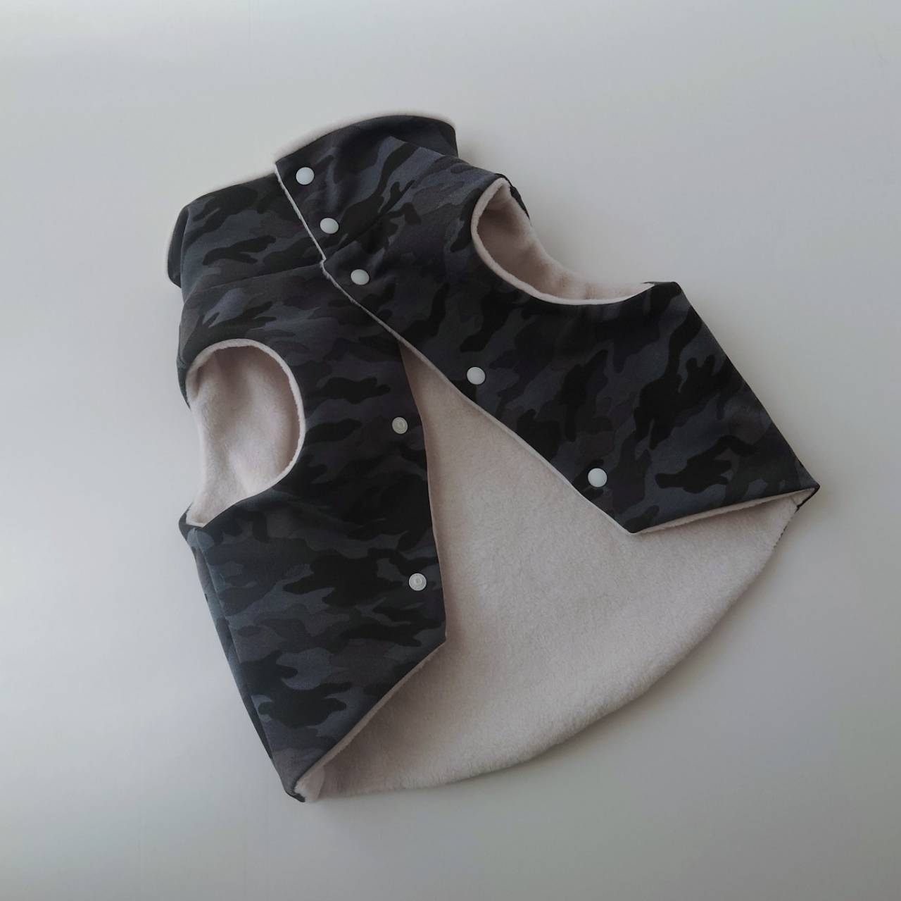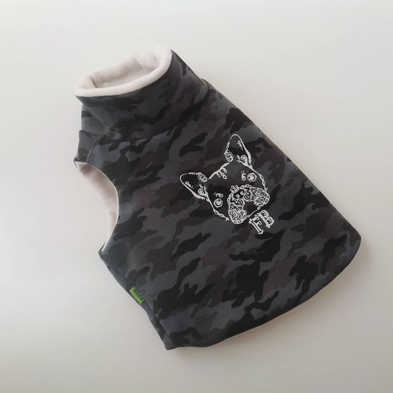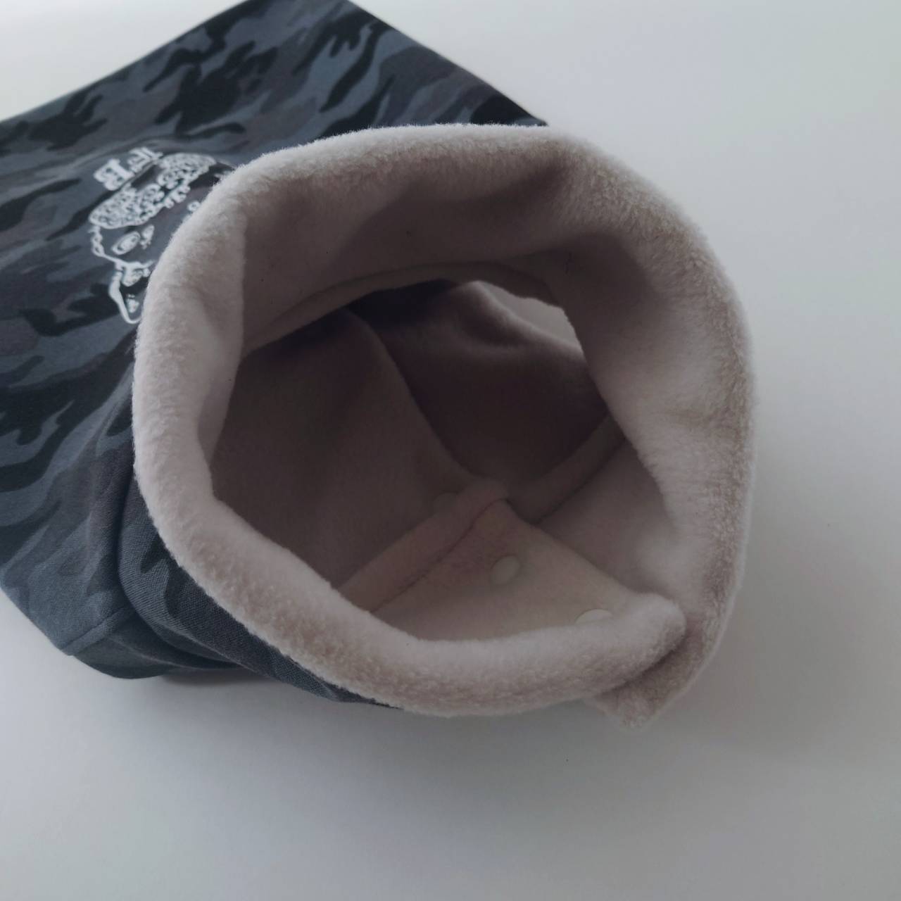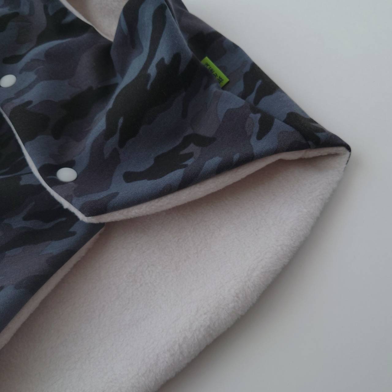 迷彩生地、フリース生地ともに伸びが少ない生地ですので、脱ぎ着を考慮しゆったりめに製作しています
