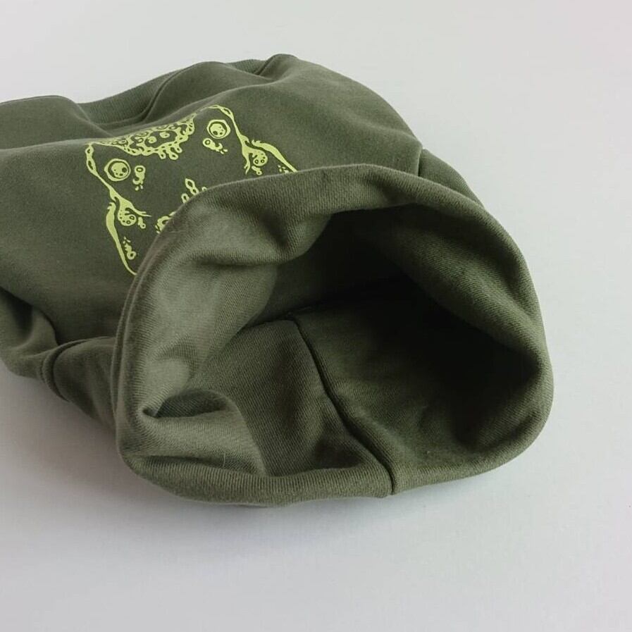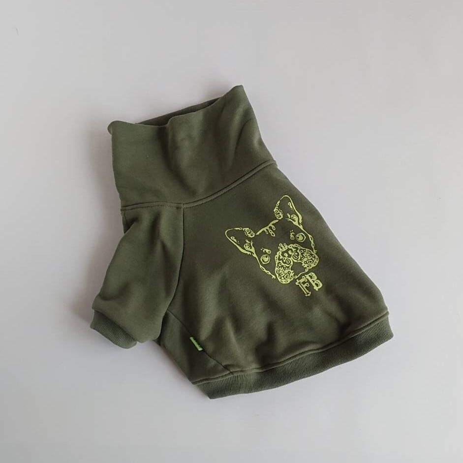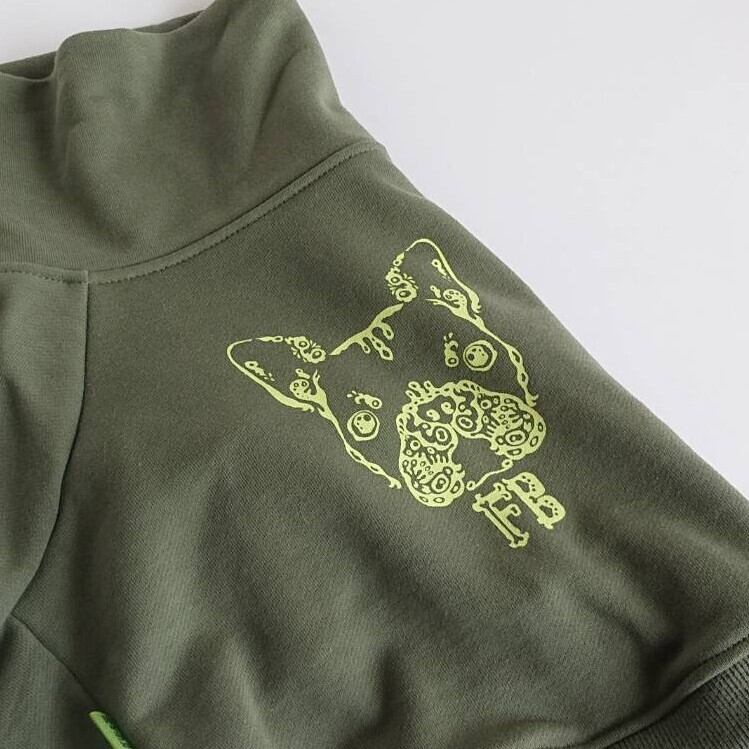 優しいモスグリーンに、レモンイエローの伝七プリントが可愛く映える